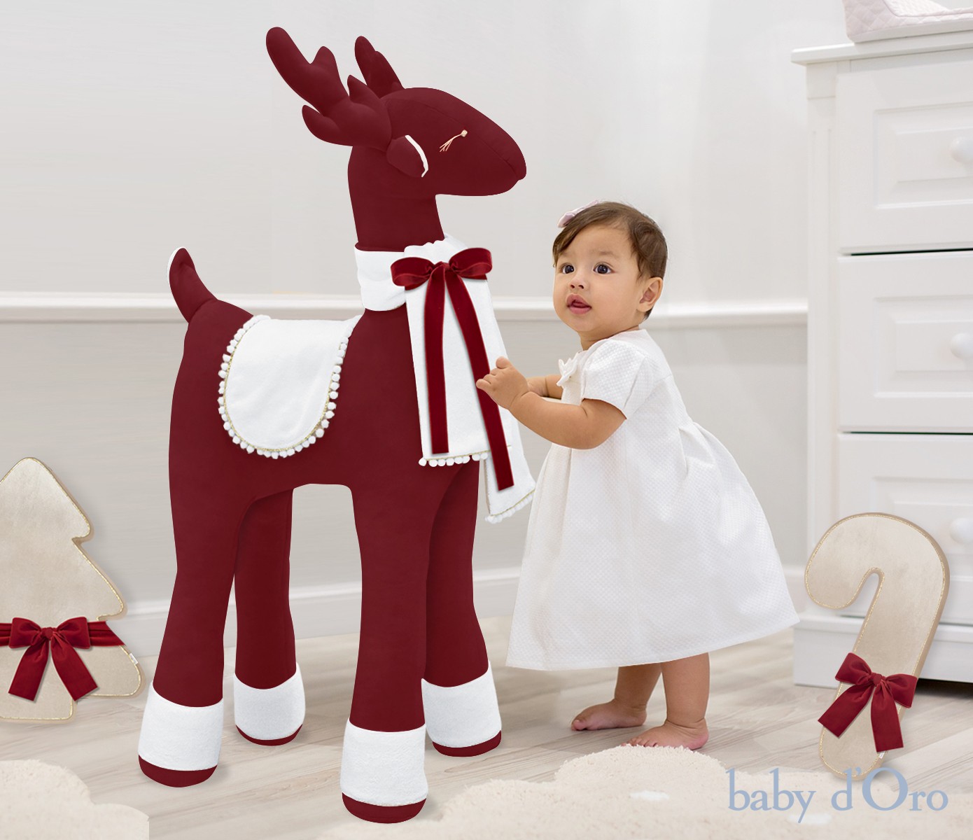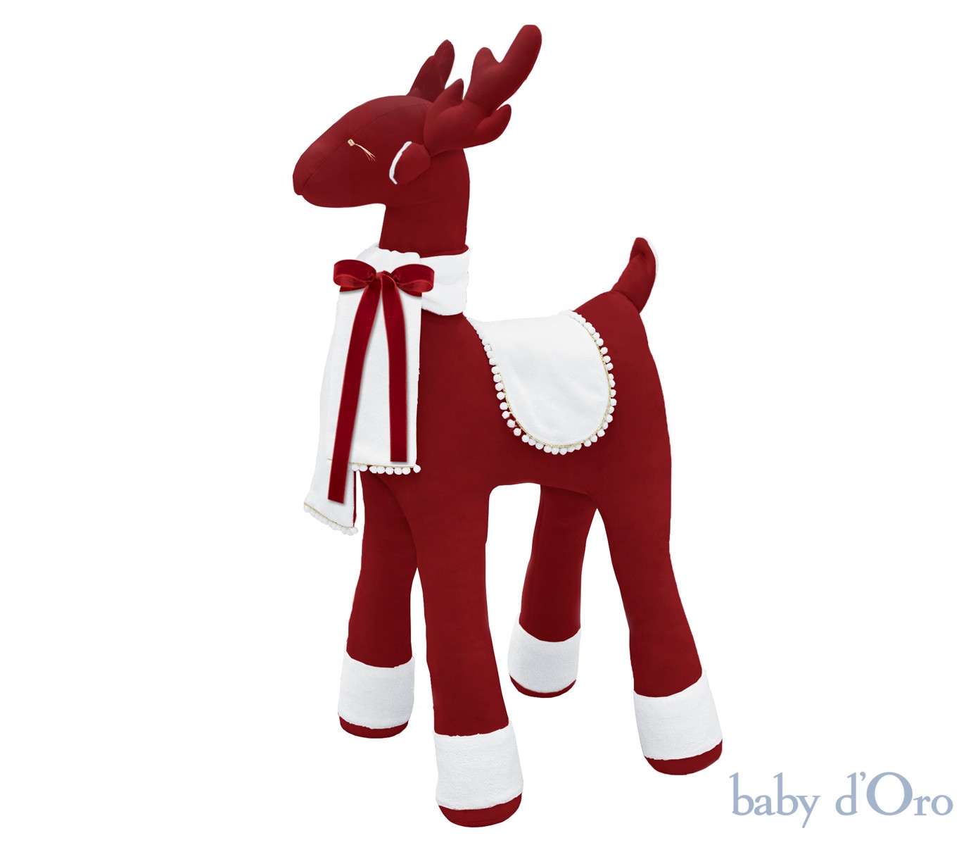 Uroczy, niepowtarzalny świąteczny renifer w rozmiarze XL, wprowadzi magiczną atmosferę świąt do Twojego domu. Ozdobiony jest puszystym szaliczkiem w kolorze śnieżnej bieli z delikatną złotą wypustką i mięciutkimi mini pomponikami. Nasz renifer to idealny pomysł na prezent, który stanie się wyjątkową dekoracją świąteczną i sprawi wiele radości osobie obdarowanej. Uroku dodają mu ręcznie wyszywane złote oczka z długimi rzęsami, białe puchate skarpetki oraz słodki zadarty reniferowy ogonek. Dekoracja wykonana jest z najwyższej jakości aksamitnej tkaniny w technologii Cleanaboo®, która zapewnia łatwe usuwanie zabrudzeń.