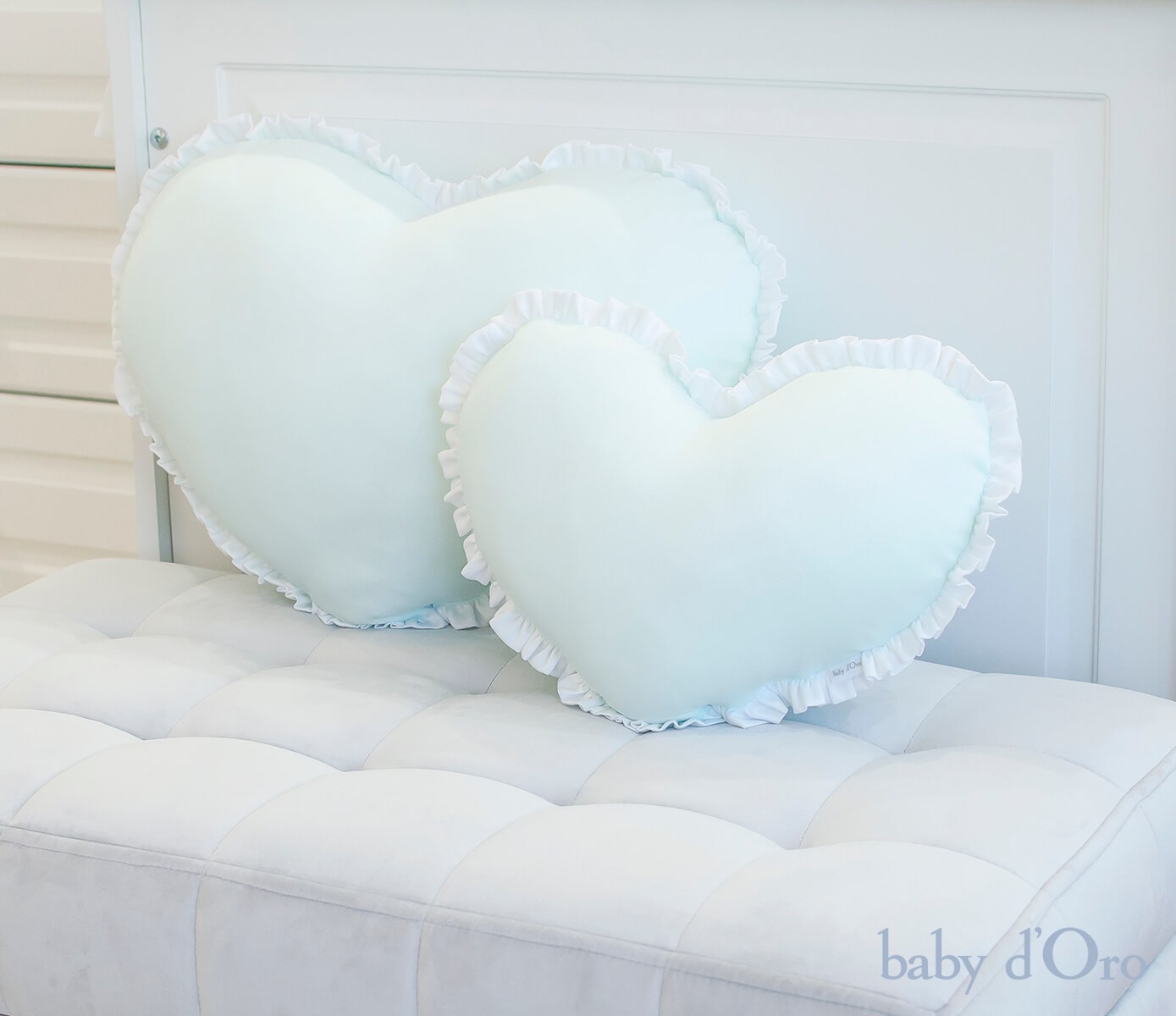 Delikatna i romantyczna miętowa poduszka w kształcie serduszka z satynową falbanką doda elegancji i szyku w pokoju Małej Księżniczki.