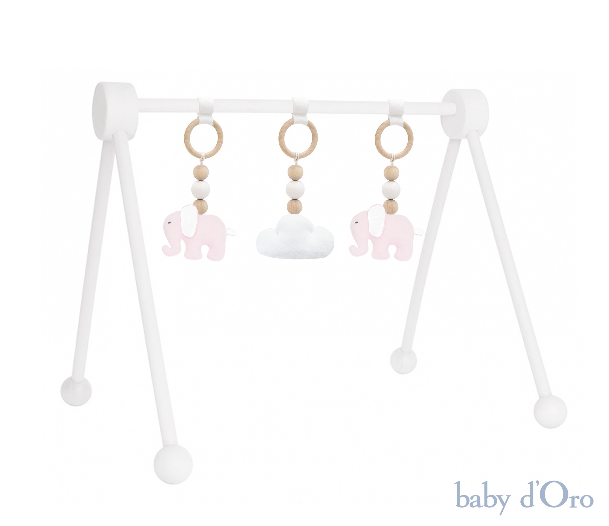 Baby Gym is made of natural white wood. Powder elephants and a white cloud stimulate children to play and move. Lying under Baby Gym will become your child's favorite form of spending free time!