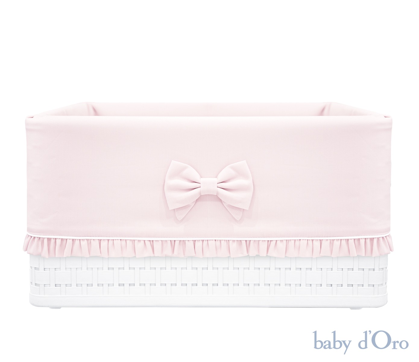 This stylish, functional basket with a powder-colored trim, adorned with a charming ruffle and a subtle bow, is the perfect way to organize your child's room. Perfect for storing toys, clothes, or small accessories for your little one. The basket's beauty comes from the natural, soft rattan weave, which, combined with the elegant trim, creates a spectacular effect. The basket is made of high-quality plastic, produced using 100% green energy. It is certified: Blue Angel – ecological certification, ISCC – international certification for sustainable raw materials and CO2, and EcoLoop – closed-loop recycling of plastics.