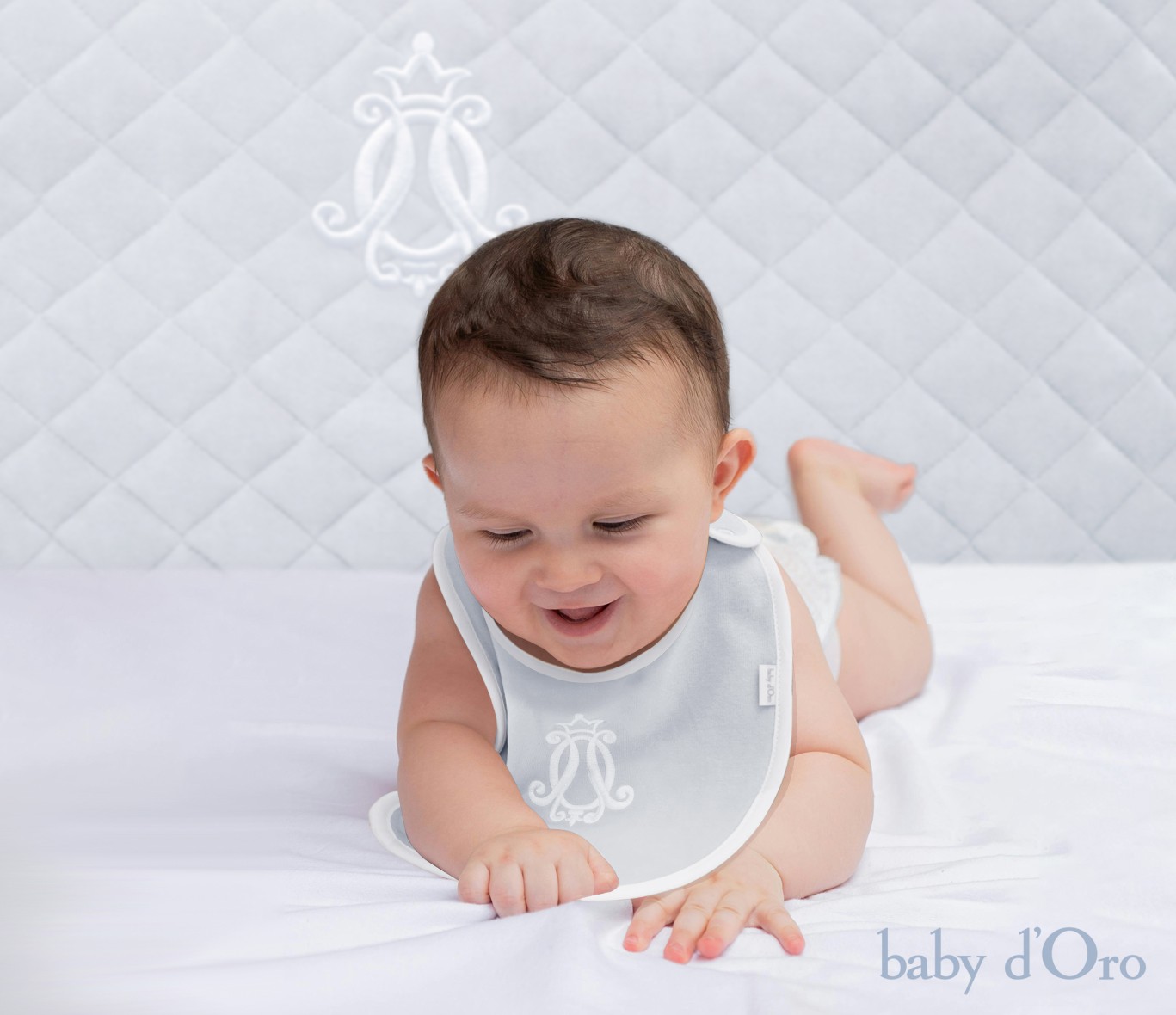 Elegant, grey baby bib from the Lovely Grey collection is made of very soft velor. Practical mini-snap closure allows easy putting on and taking off the bib. Delicate satin trim and a white baby d'Oro emblem add style and elegance.