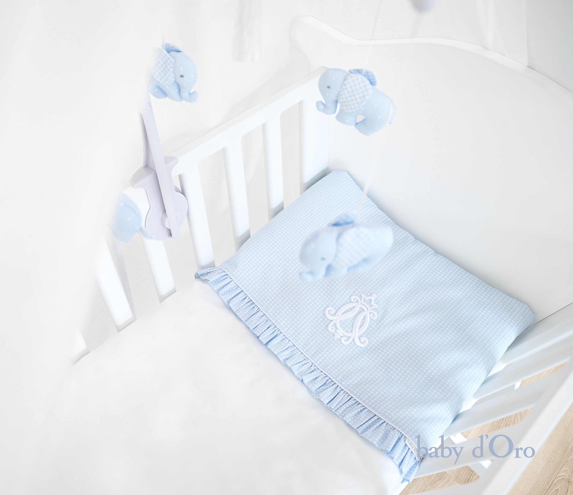 Carousel with a music box for a child's bed, decorated with blue bow and blue elephant. The carousel is sold complete with a mounting bracket.