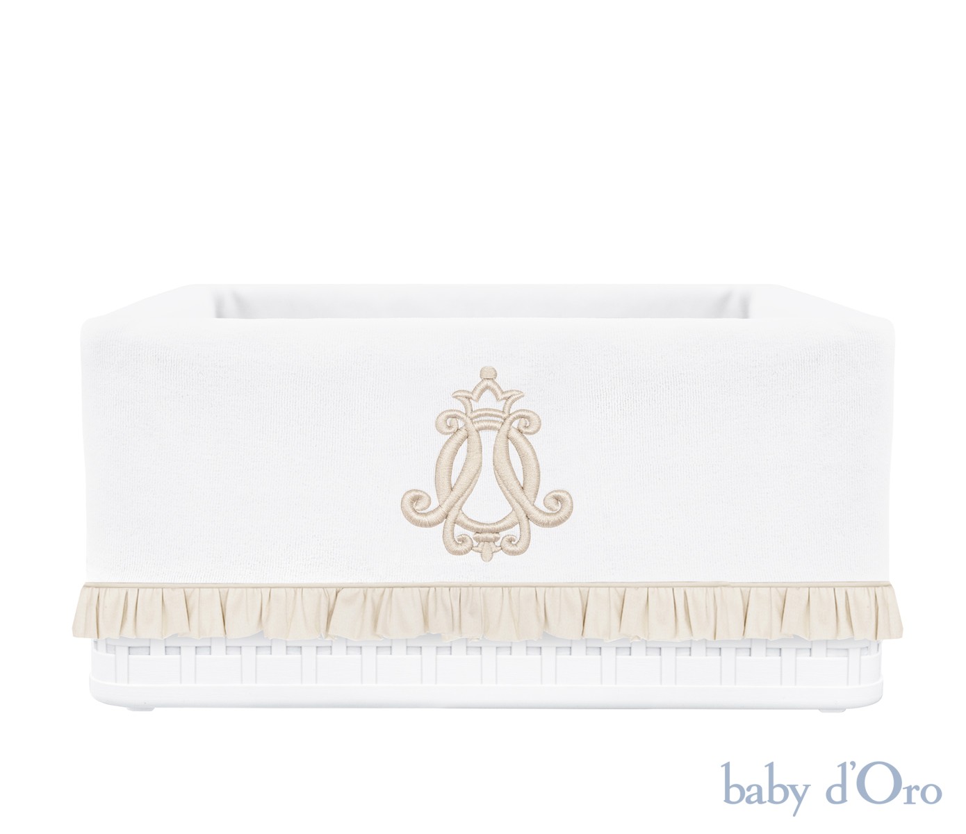 This stylish, functional basket with a velvety white trim, adorned with a charming almond beige ruffle, and an elegant beige emblem is the perfect way to organize your child's room. It's perfect for storing toys, clothes, or small accessories for your little one. The basket's beauty comes from its natural, soft rattan weave, which, combined with the elegant trim, creates a spectacular effect. The basket is made of high-quality plastic, produced using 100% green energy. It is certified: Blue Angel - ecological certification, ISCC - international certification for sustainable raw materials and CO2, and EcoLoop - closed-loop recycling of plastics.