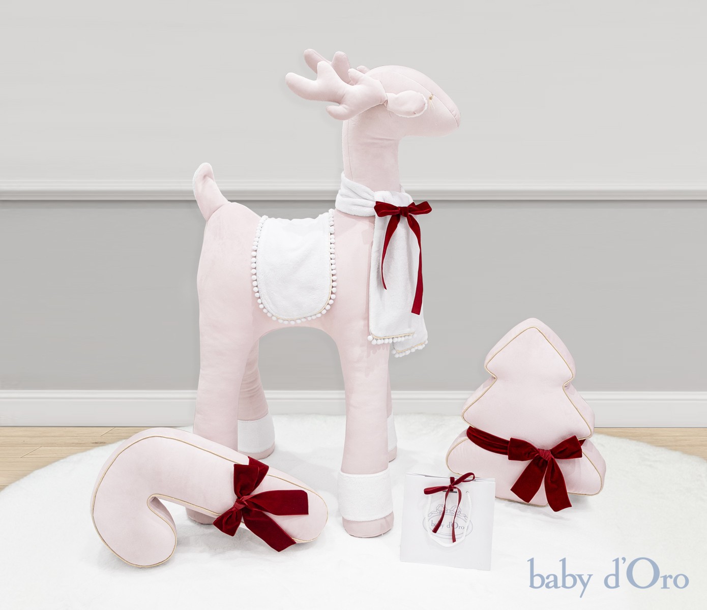 A charming, unique XL Christmas reindeer will bring a magical Christmas atmosphere to your home. It is decorated with a fluffy, snow-white scarf with a delicate gold piping and soft mini pompoms. Our reindeer is a perfect gift idea that will become a unique Christmas decoration and will bring a lot of joy to the recipient. Hand-embroidered silver eyes with long eyelashes, white fluffy socks and a sweet upturned reindeer tail add to its charm. The decoration is made of the highest quality velvet fabric using Cleanaboo® technology, which ensures easy removal of dirt.