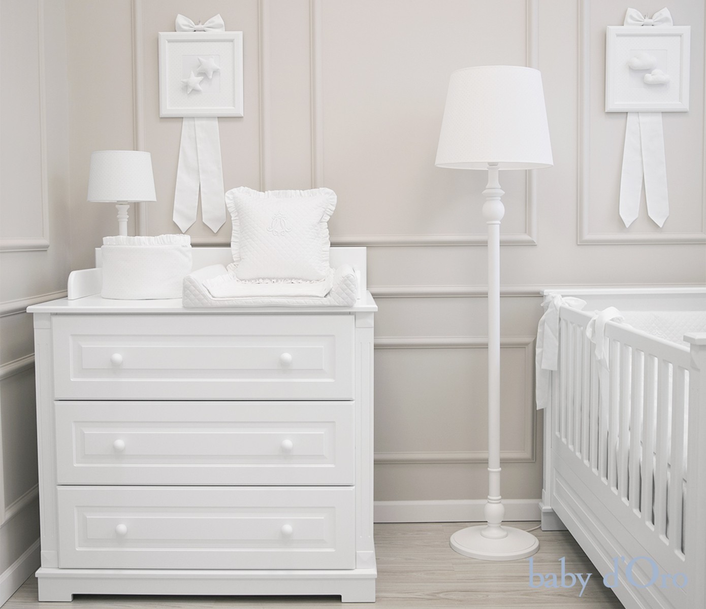 Stylowa, biała komoda linii Cap Ferrat to niezbędny element wyposażenia pokoju dziecięcego. Posiada trzy pojemne szuflady oraz charakterystyczne pilastry, cokół w podstawie wycięty jest pod kątem prostym. Komoda doskonale sprawdzi sie zarówno w pokoju Małej Księżniczki jak i Małego Księcia.