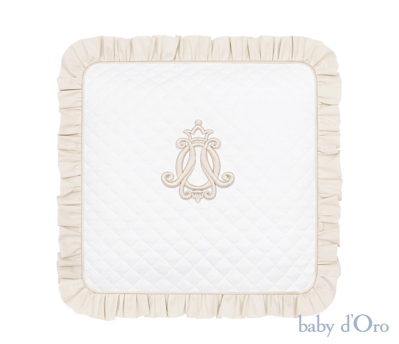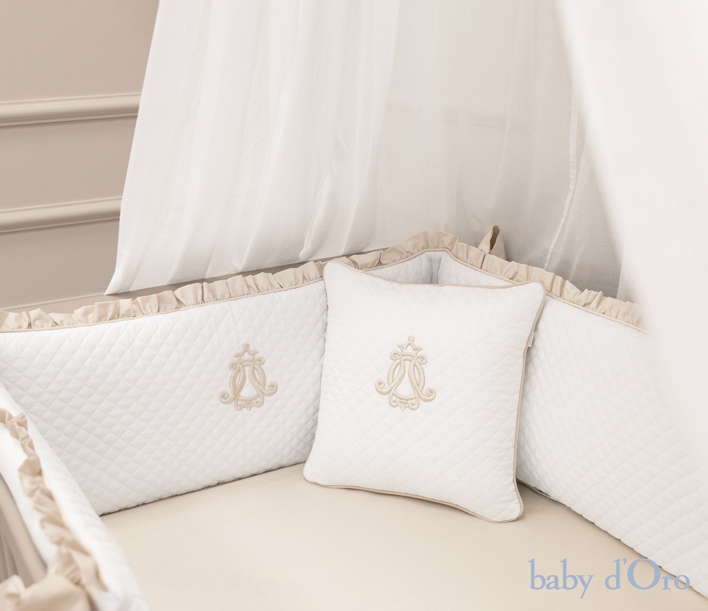 The elegant quilted Classic Almond pillow with flounce is a unique decoration that will perfectly emphasize the character of a children's interior. It is made of white quilted fabric decorated with an inset in a noble shade of delicate almond beige. The whole thing is decorated with an elegant, subtly shiny baby d'Oro emblem.