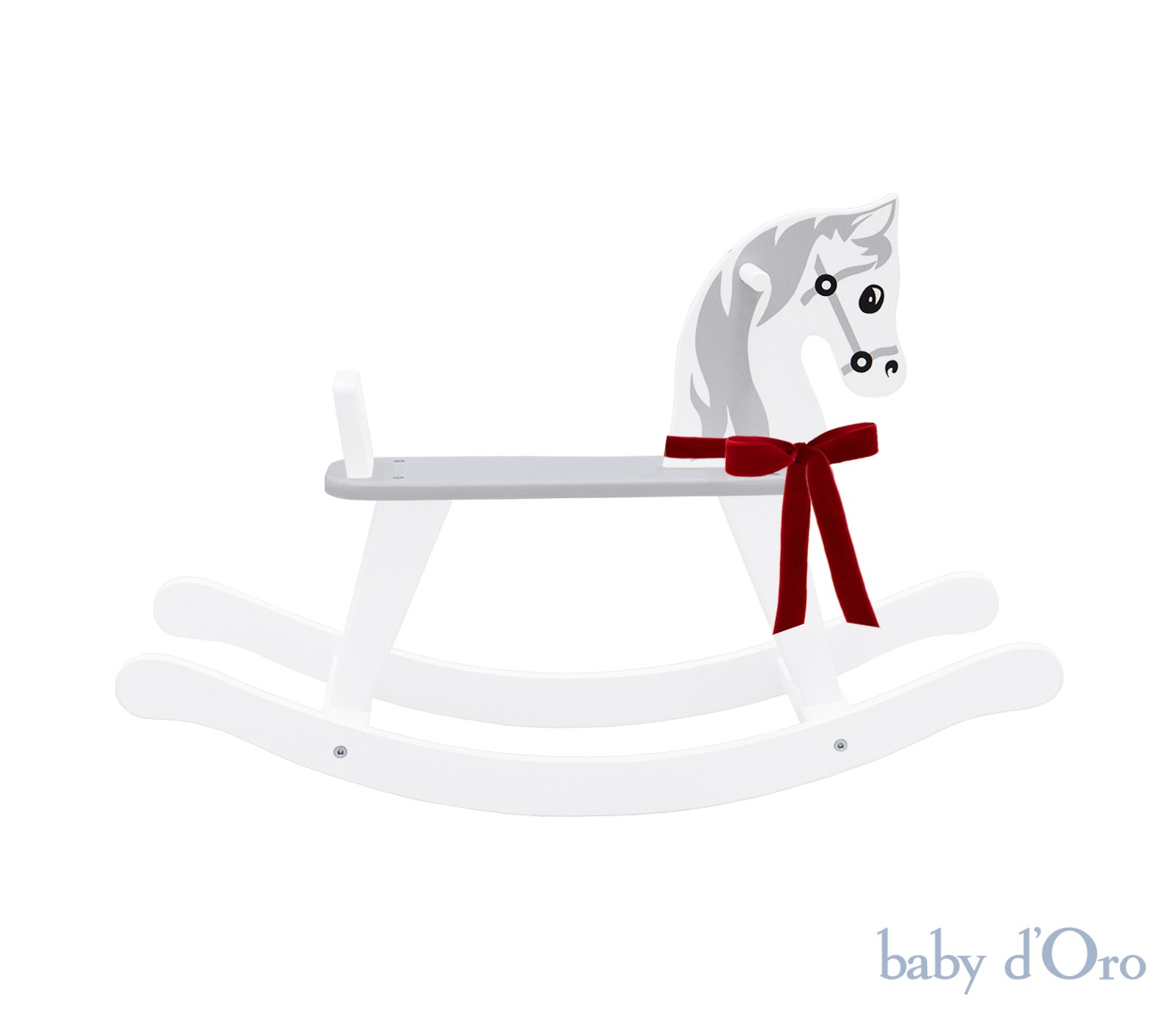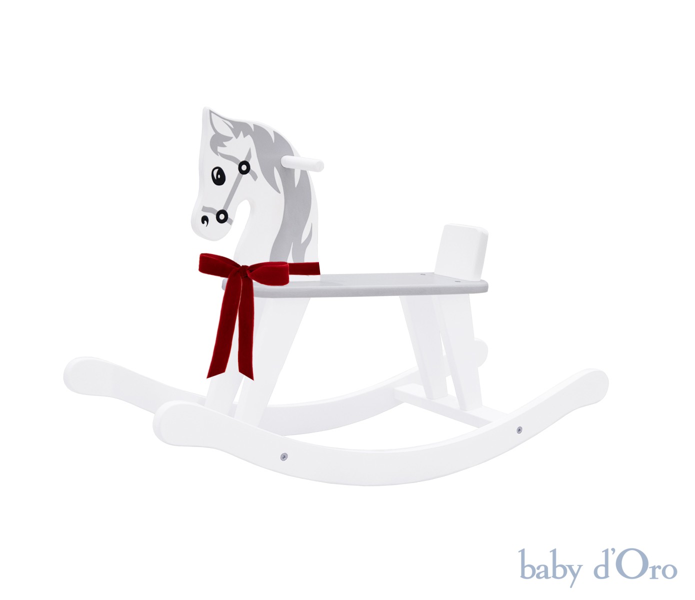 A charming, classic, white and gray rocking horse with red bow is a timeless toy that will give a lot of joy to every baby. It is made of certified natural wood, which comes only from controlled European resources. Hand-painted details such as eyes and mane create its unique character. The skids of our horse have been designed in such a way that they prevent overloading even with the most intense swinging of the child. Our rocking horse meets the requirements of the Toy Safety Directive 2009/48/EC and the following safety standards: EN71-1:2014+A1:2018, EN71-2:2011-A1:2014, EN71-3:2013-A3:2018. It will surely be a favorite toy for a long time. The horse also looks beautiful in the room as a classic decoration. Intended for children over 18 months of age and will be a perfect gift.