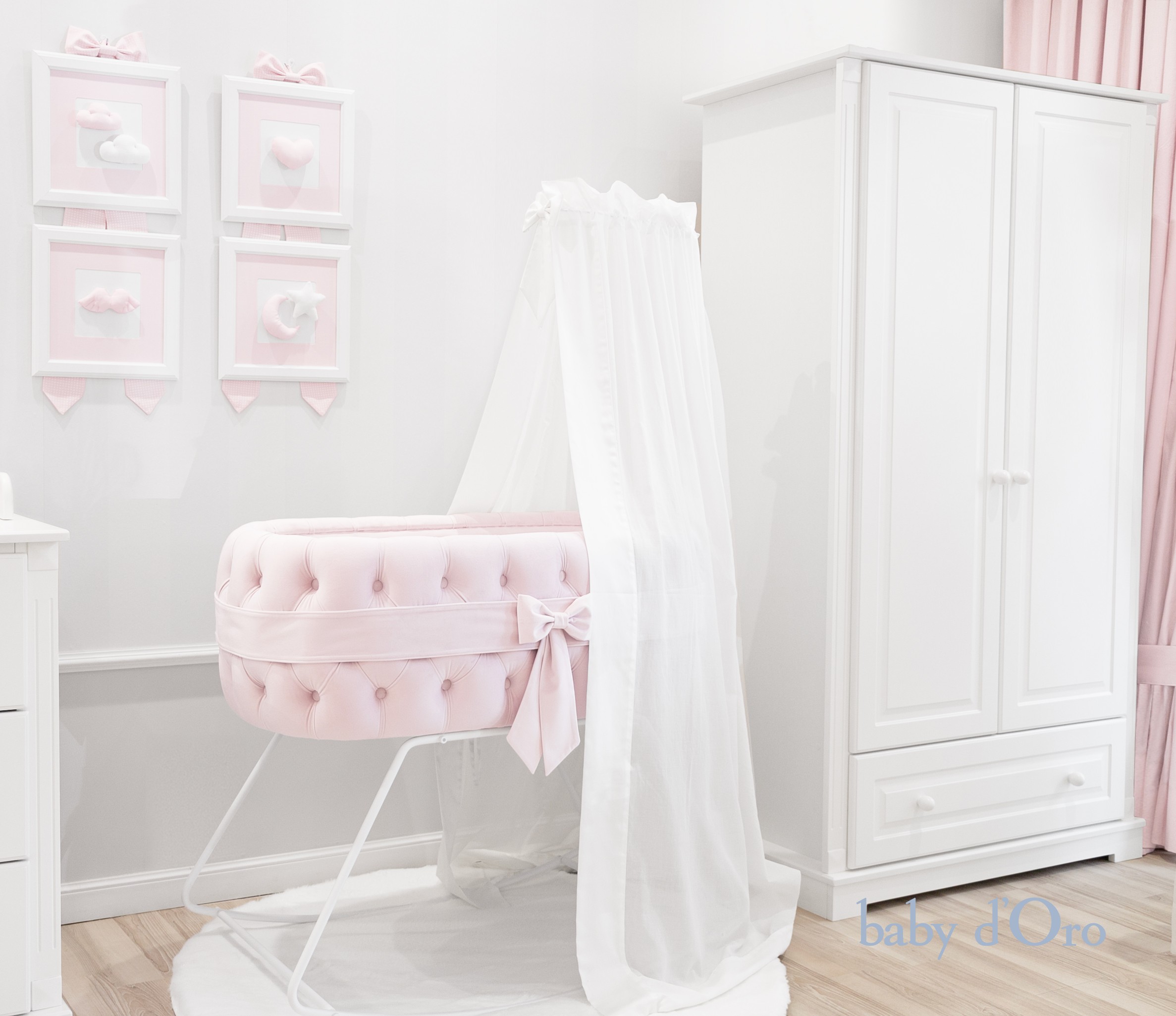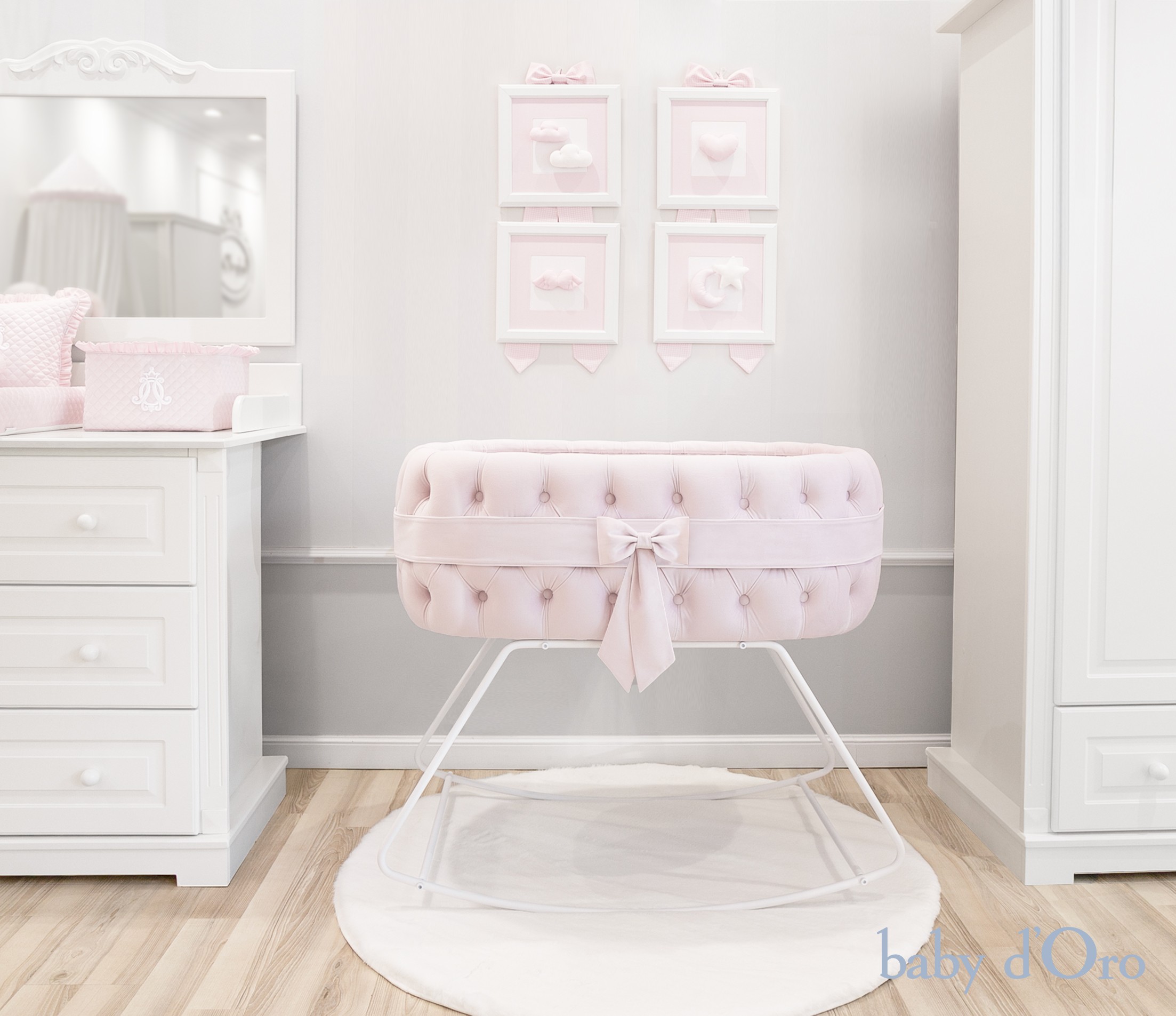 A timeless, upholstered, light pink cradle on a stable, rocking base with a decorative sash decorated with a large velvet bow. Thanks to the Velcro fastening, the decorative sash with a bow can be placed anywhere - on the front or on the side of the cradle. The baby cradle is perfect for the first months of the baby's life. Thanks to its small dimensions, it can be easily placed in the parents' bedroom, so that the baby is always close to the mother. Smooth, gentle rocking soothes and deepens sleep, ensuring comfort and safety. The classic and elegant cradle will fit perfectly into the decor of both girls' and boys' rooms.