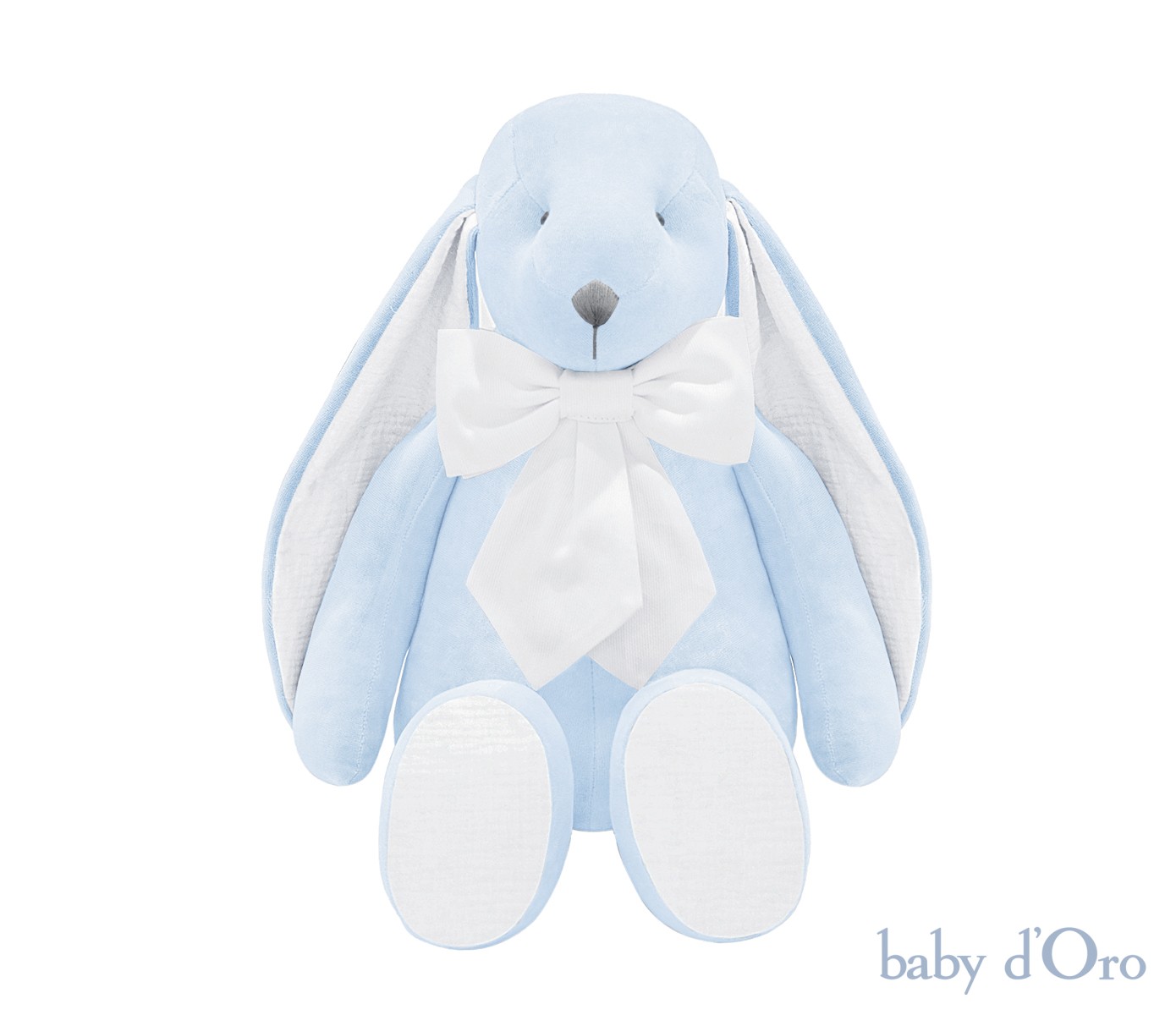 Un lapin bleu unique en son genre, confectionné dans un velours tout doux. Les oreilles du lapin ainsi que son nœud sont réalisés dans un tissu blanc délicat. Son adorable petit nez gris donnera envie à chaque enfant de le serrer tendrement dans ses bras. Notre lapin sera sans aucun doute le premier ami idéal de votre tout-petit.