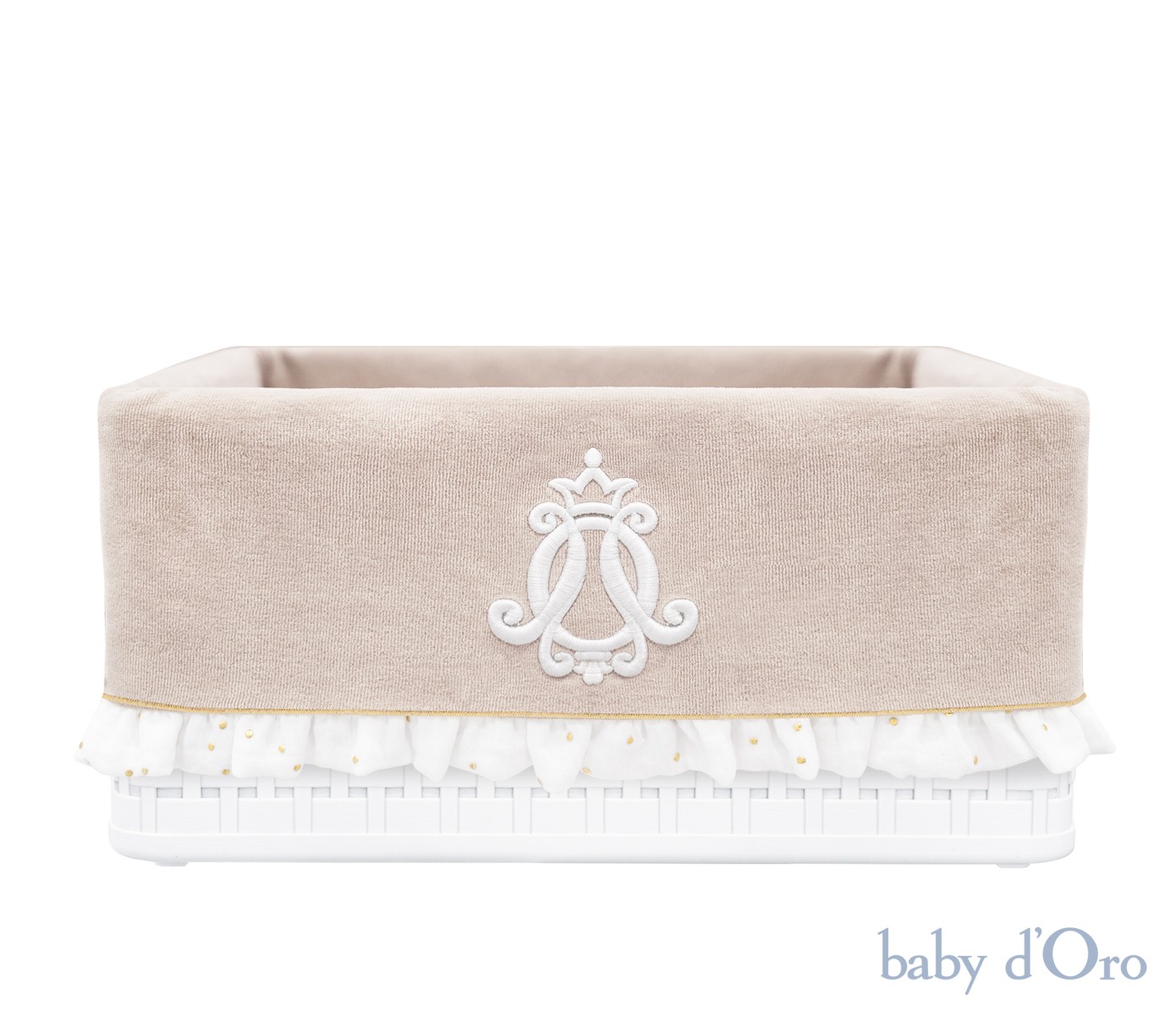 Stylowy, funkcjonalny koszyk z welurowym beżowym obszyciem, ozdobiony uroczą muślinową falbanką w połyskujące złote kropeczki oraz eleganckim białym emblematem to idealny sposób na zorganizowanie przestrzeni w pokoju dziecka. Świetny do przechowywania zabawek, ubranek lub drobnych akcesoriów Twojego Maluszka. Piękno kosza tworzy naturalny, miękki rattanowy splot, który w połączeniu z eleganckim obszyciem daje spektakularny efekt. Kosz wykonany jest ze szlachetnego tworzywa sztucznego do którego wytworzenia została użyta w 100% tylko zielona energia. Kosz posiada certyfikaty: Blue Angel - certyfikat ekologiczny, ISCC - międzynarodowy certyfikat zrównoważonych surowców i CO2, EcoLoop - recykling tworzyw w obiegu zamkniętym.