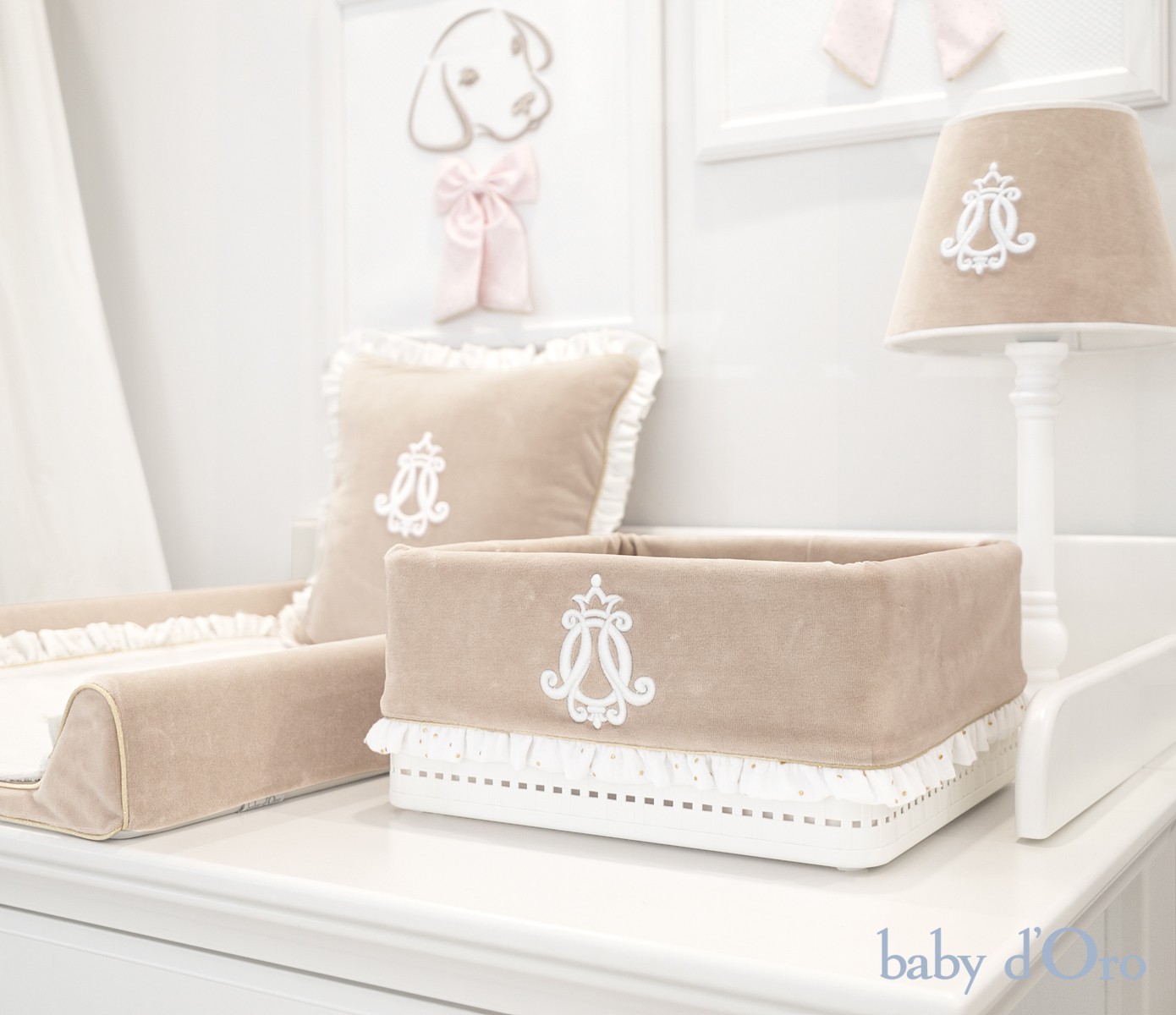 Stylowa lampka z klasyczną, białą podstawą oraz eleganckim welurowym beżowym abażurem ozdobiony eleganckim białym emblematem. Lampka jest niezbędnym elementem wyposażenia dziecięcego pokoju, jej dyskretne światło stworzy miły i ciepły nastrój. Jest idealna na szafkę nocną, komodę czy biurko.