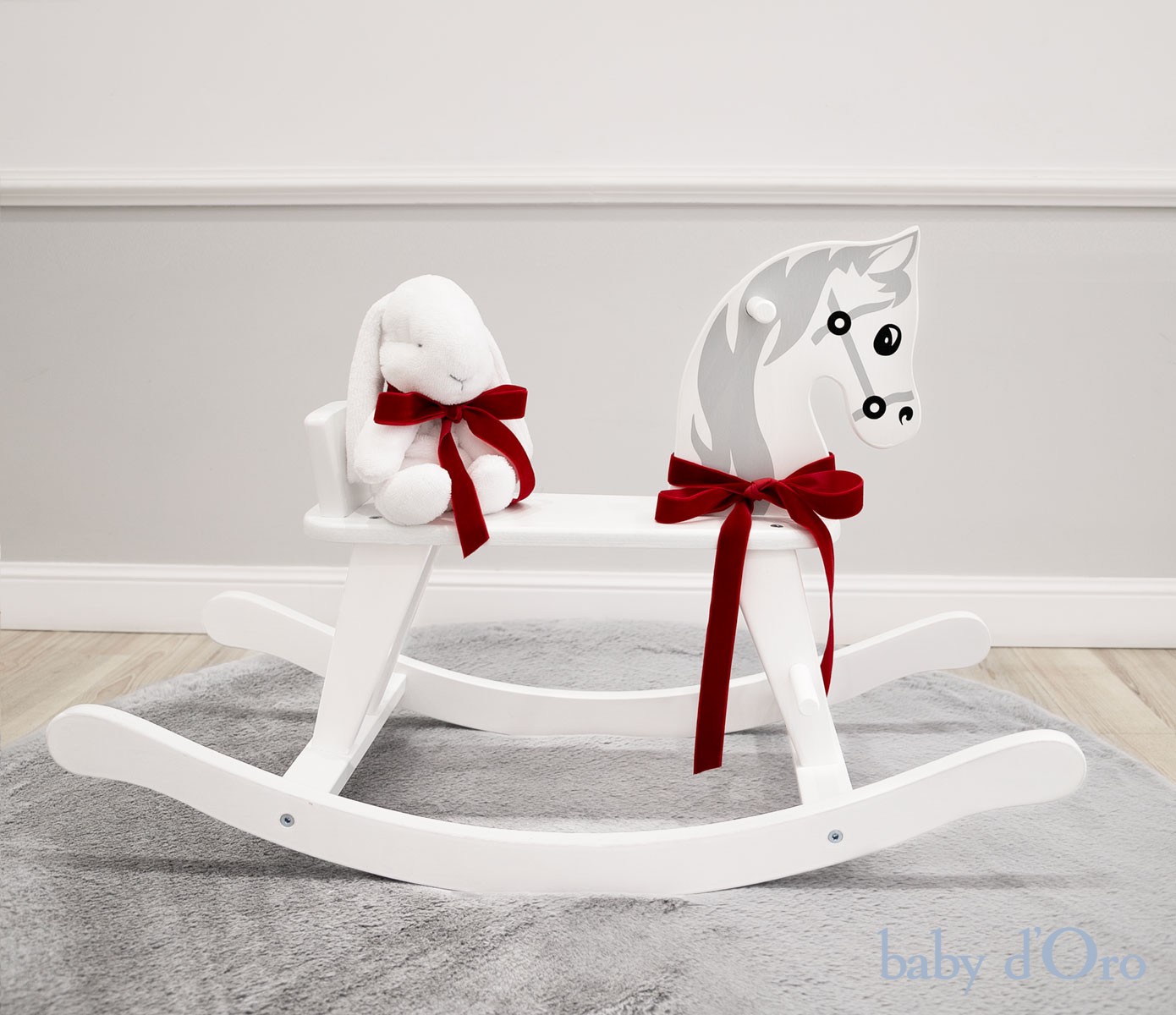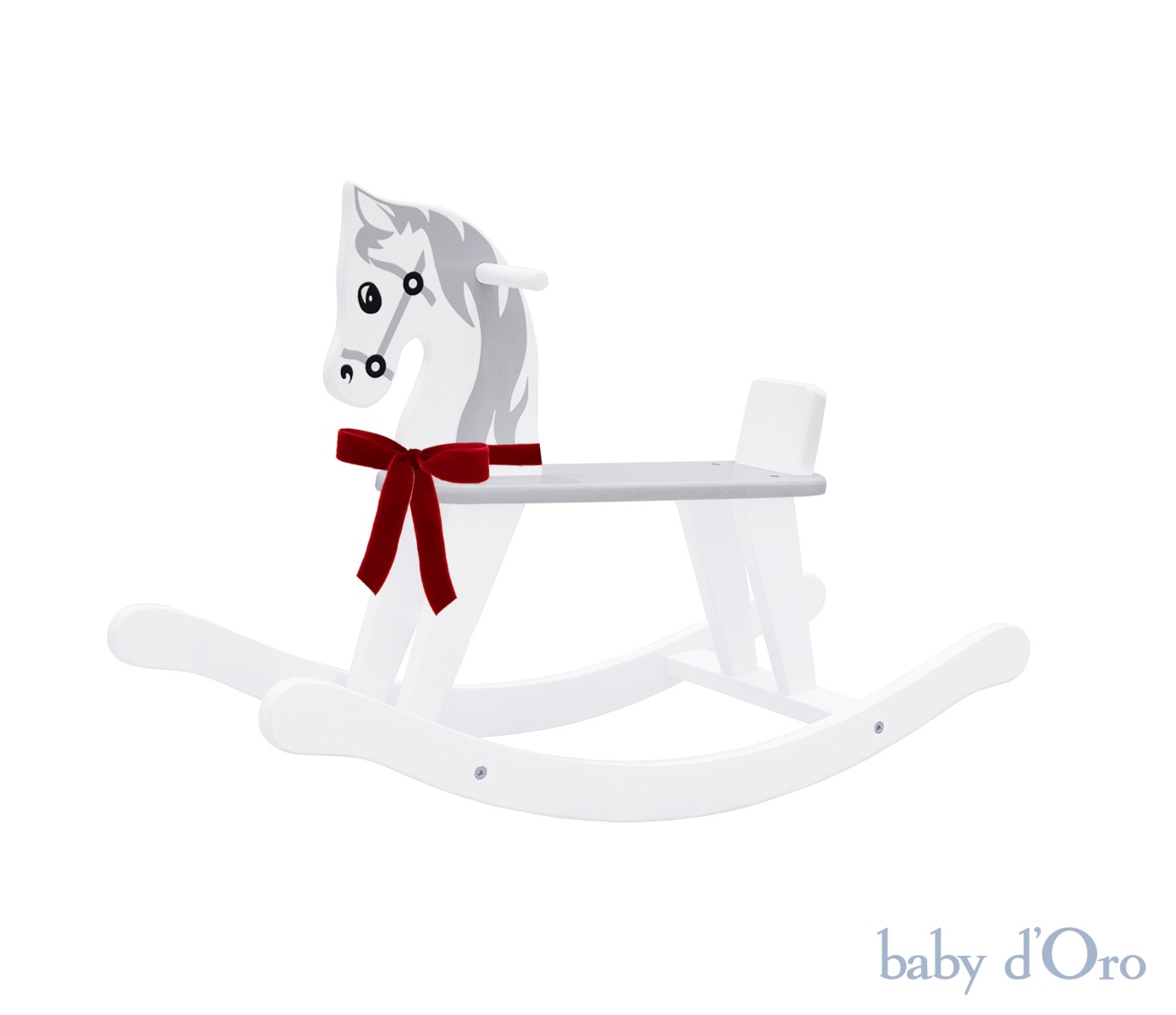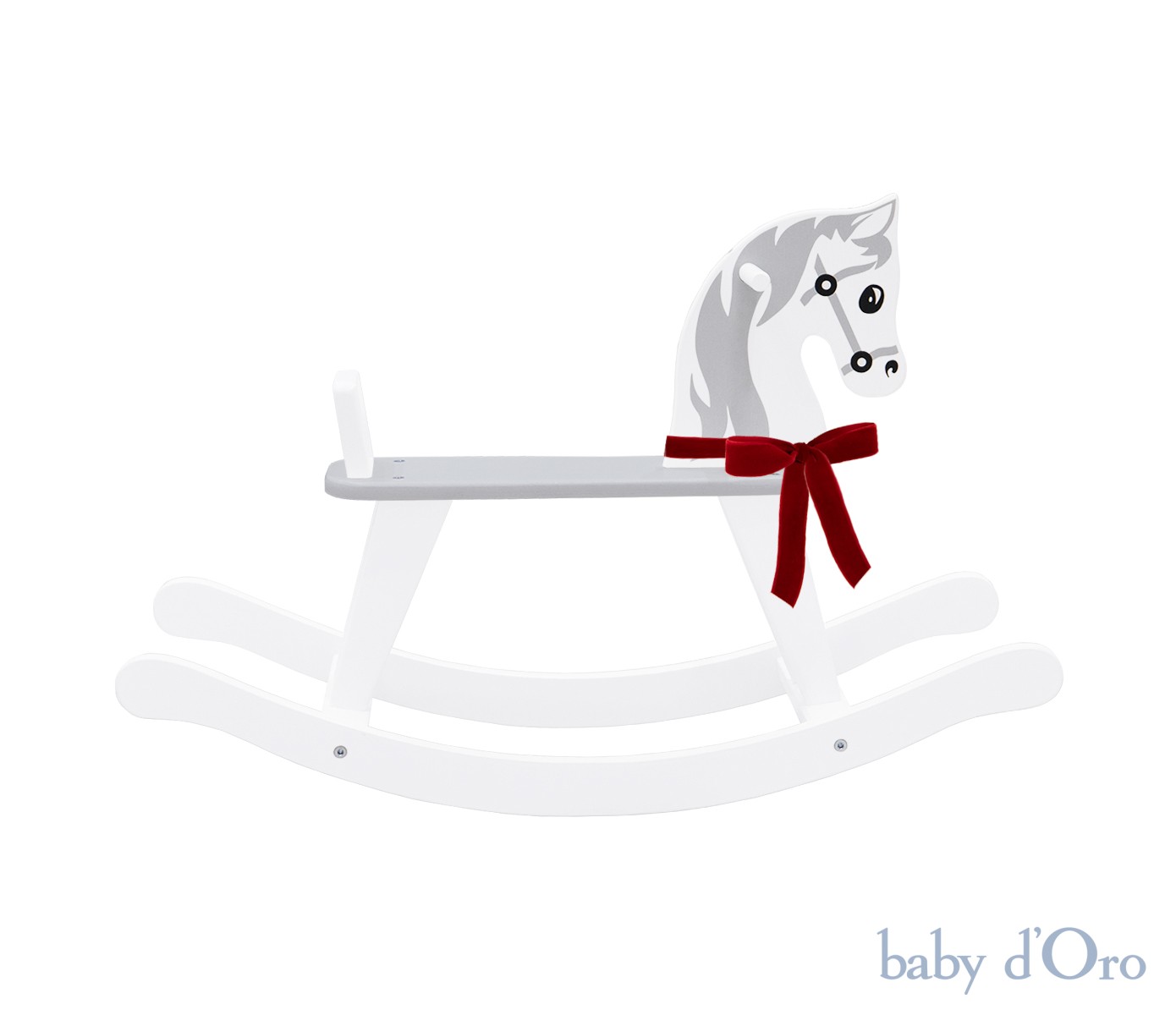 Uroczy, biało szary koń na biegunach z czerwoną kokardką to ponadczasowa zabawka, która da wiele radości każdemu Maluszkowi. Wykonany jest z atestowanego naturalnego drewna, które pochodzi wyłącznie z kontrolowanych, europejskich zasobów. Ręcznie malowane detale takie jak oczka oraz grzywa tworzą jego niepowtarzalny charakter. Płozy konika zostały zaprojektowane w taki sposób, aby przy nawet najintensywniejszym huśtaniu się dziecka zapobiegały przeciążeniu. Nasz koń na biegunach spełnia wymogi dyrektywy dotyczącej bezpieczeństwa zabawek 2009/48/WE oraz następujące normy bezpieczeństwa:EN71-1:2014+A1:2018, EN71-2:2011-A1:2014, EN71-3:2013-A3:2018. Z pewnością będzie ulubioną zabawką przez długi czas. Konik pięknie prezentuje się w pokoju również jako klasyczna dekoracja. Przeznaczony jest dla dzieci powyżej 18 miesiąca życia i będzie idealnym prezentem.