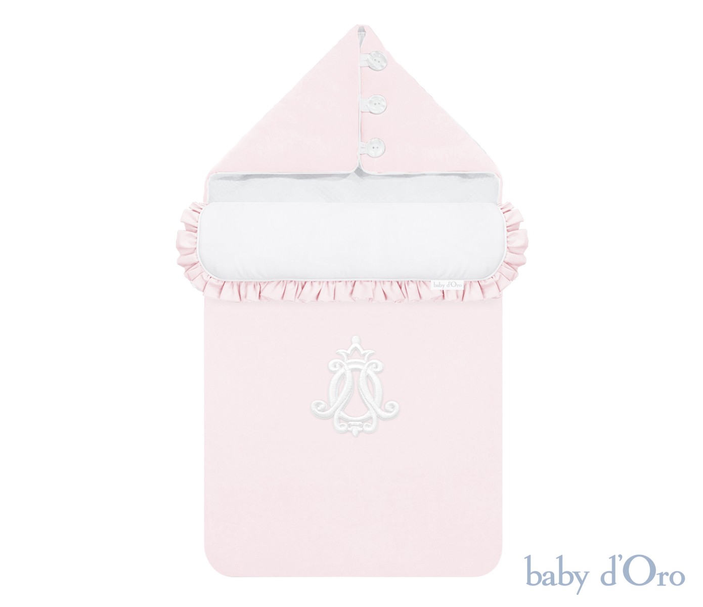 Elegancki i praktyczny śpiworek Royal Baby Poudre wykonany z niezwykle delikatnego pudrowego weluru, podkreślonego klasyczną białą wypustką. Pięknym wykończeniem śpiworka jest haftowany biały emblemat oraz urocza pudrowa falbanka. Kapturek zapinany na perłowe guziki z subtelnym logo baby d'Oro. Zastosowane w śpiworku wysokopuszyste wypełnienie oraz mięciutkie welurowe wnętrze zapewnia Maleństwu komfort, ciepło i poczucie bezpieczeństwa.