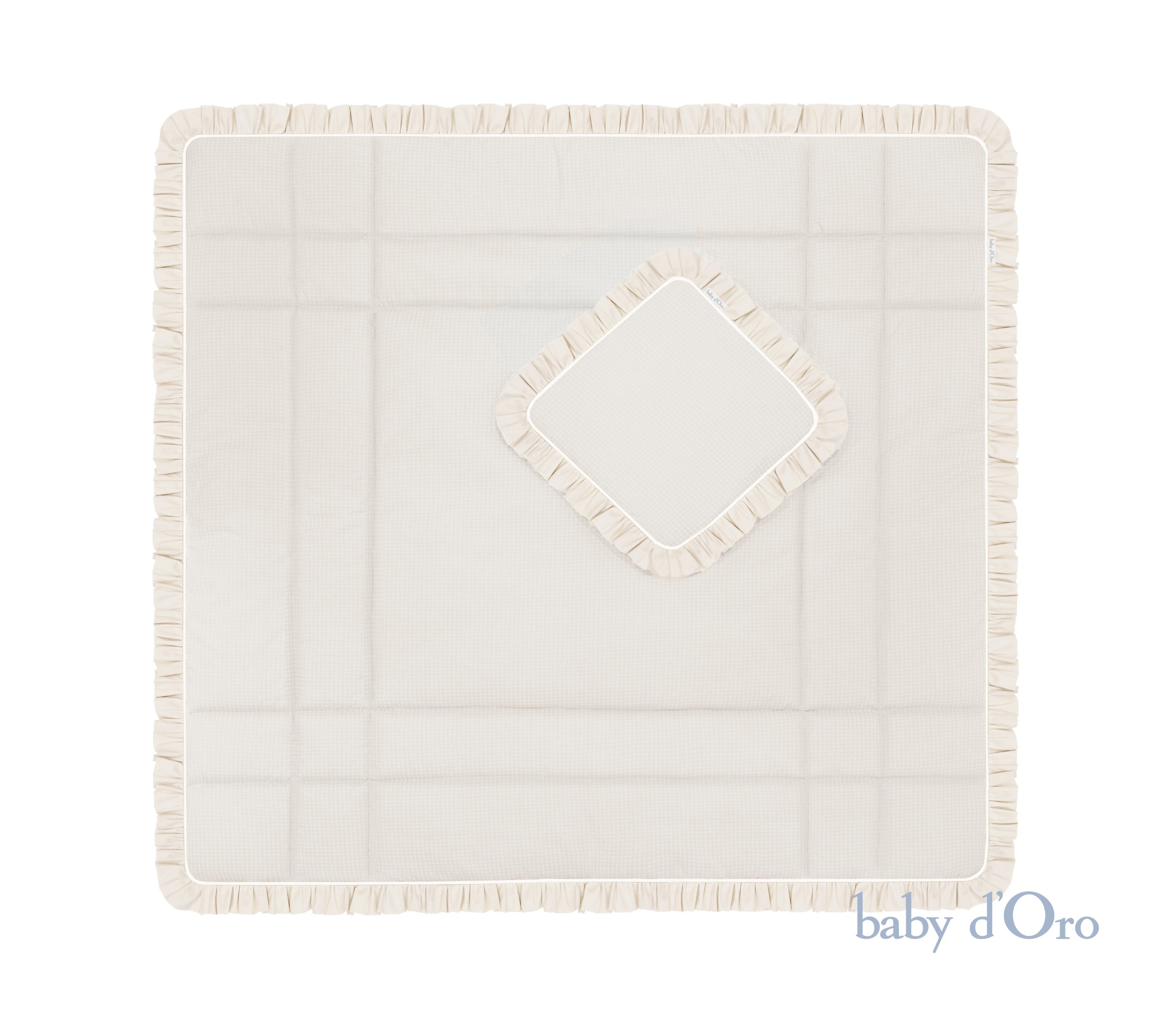 A beautiful and functional play mat Classic Almond with a pillow decorated with a lovely flounce, in a noble shade of delicate almond beige, ideal for fun both at home and in the garden. Thanks to its fluffiness and thickness, it perfectly insulates from the ground. Perfect for learning to sit, play and relax. The mat was made of the highest quality beige cotton in delicate mini squares. Our mat will be irreplaceable in the first months of a baby. It will also be a fantastic gift for a preschool child.