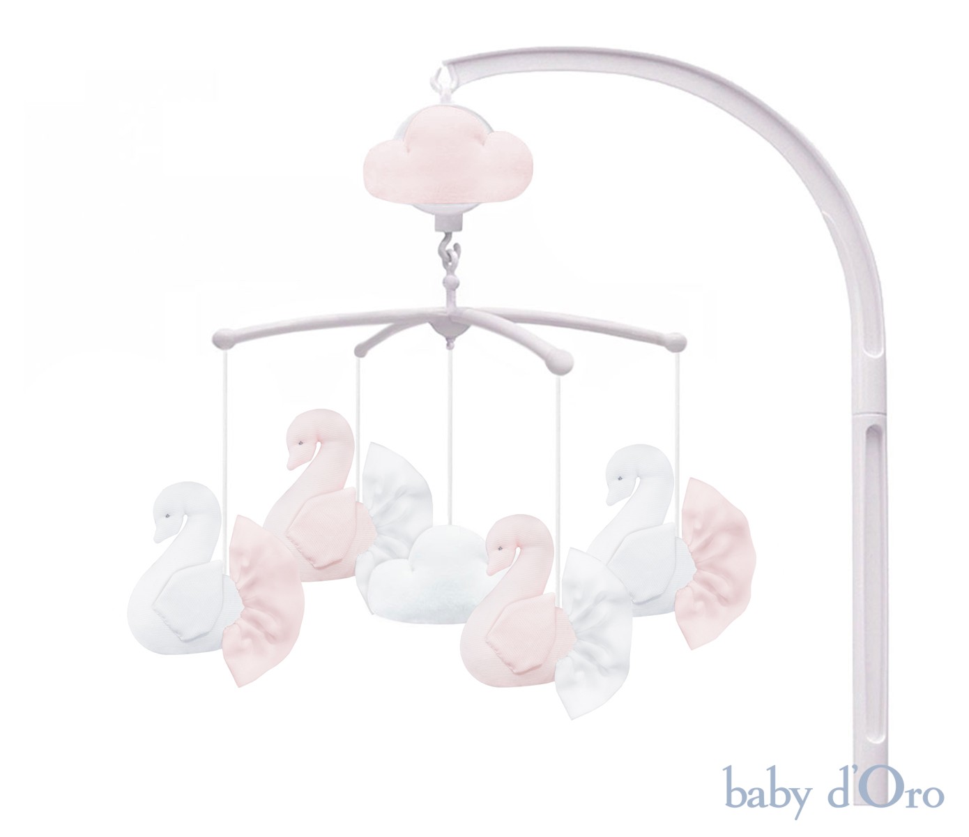 Urocza, klasyczna, karuzela z pozytywką, której delikatna, spokojna melodia utuli Maluszka do snu. Motyw pudrowo-białych łabędzi z efektowną falbanką oraz puszyste welurowe chmurki to idealne dopełnienie naszej kolekcji Royal Baby Poudre. Karuzela wyposażona jest w łatwy w montażu uchwyt mocujący do boku łóżeczka. W skład zestawu wchodzą: pozytywka, uchwyt mocujący w kolorze kamiennej bieli oraz krzyżak z elementami dekoracyjnymi. Sznureczki karuzeli są regulowane, dzięki czemu można je skrócić na dowolną długość.