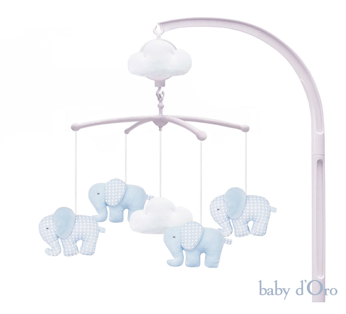 Urocza, klasyczna, karuzela z pozytywką, której delikatna, spokojna melodia utuli Maluszka do snu. Motyw błękitnych słoników oraz puszyste welurowe chmurki to idealne dopełnienie naszej błękitnej kolekcji. Karuzela wyposażona jest w łatwy w montażu uchwyt mocujący do boku łóżeczka. W skład zestawu wchodzą: pozytywka, uchwyt mocujący w kolorze kamiennej bieli oraz krzyżak z elementami dekoracyjnymi. Sznureczki karuzeli są regulowane, dzięki czemu można je skrócić na dowolną długość. Motyw słoników znajduje się również w obrazkach dekoracyjnych 3D.