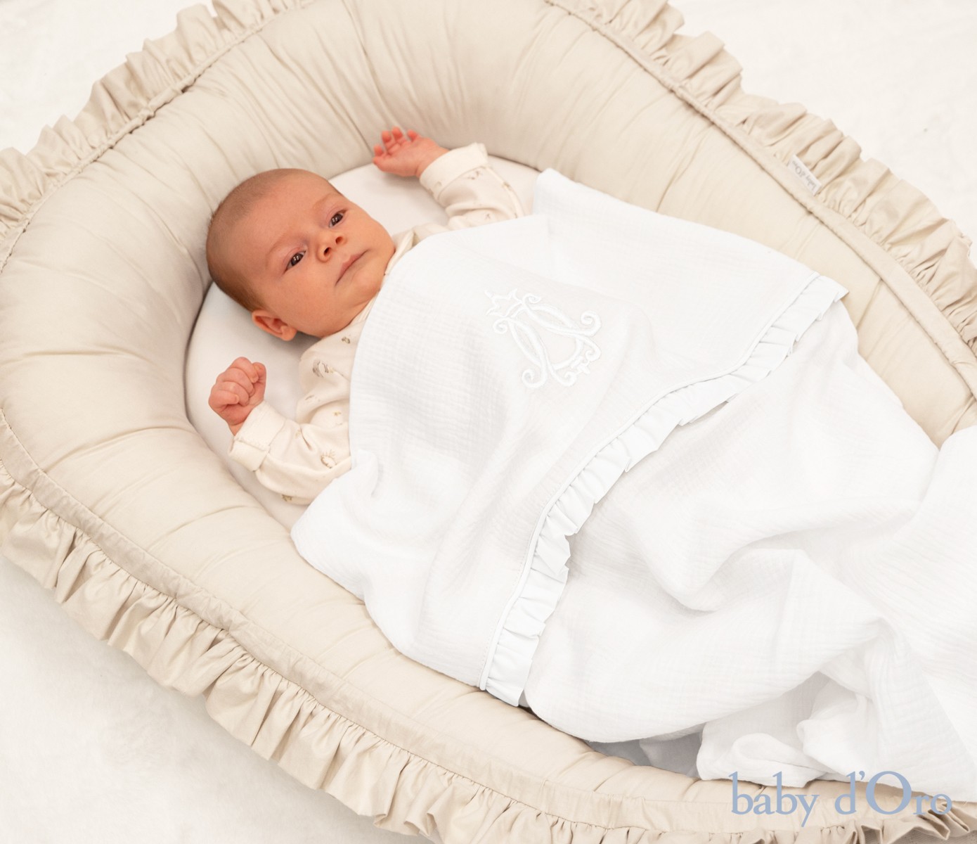 Elegancki otulacz o pięknej fakturze wykonany z najwyższej jakości białej bawełny, ozdobiony uroczą, satynową falbanką oraz subtelnie połyskującym emblematem baby d'Oro. Idealnie otuli delikatną skórę Maluszka oraz sprawdzi się jako letni kocyk, prześcieradełko lub osłona do wózka w słoneczne oraz wietrzne dni.