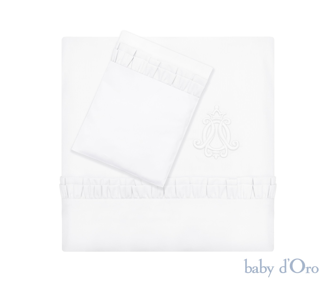 Subtelna i niezwykle elegancka, biała pościel niemowlęca ozdobiona białą falbanką i eleganckim haftem. Wykonana jest z najwyższej jakości bawełny. Bardzo delikatna satyna została wykorzystana w tych częściach pościeli, z którymi skóra dziecka ma bezpośredni kontakt, dzięki czemu maluszek ma zapewniony wysoki komfort snu.