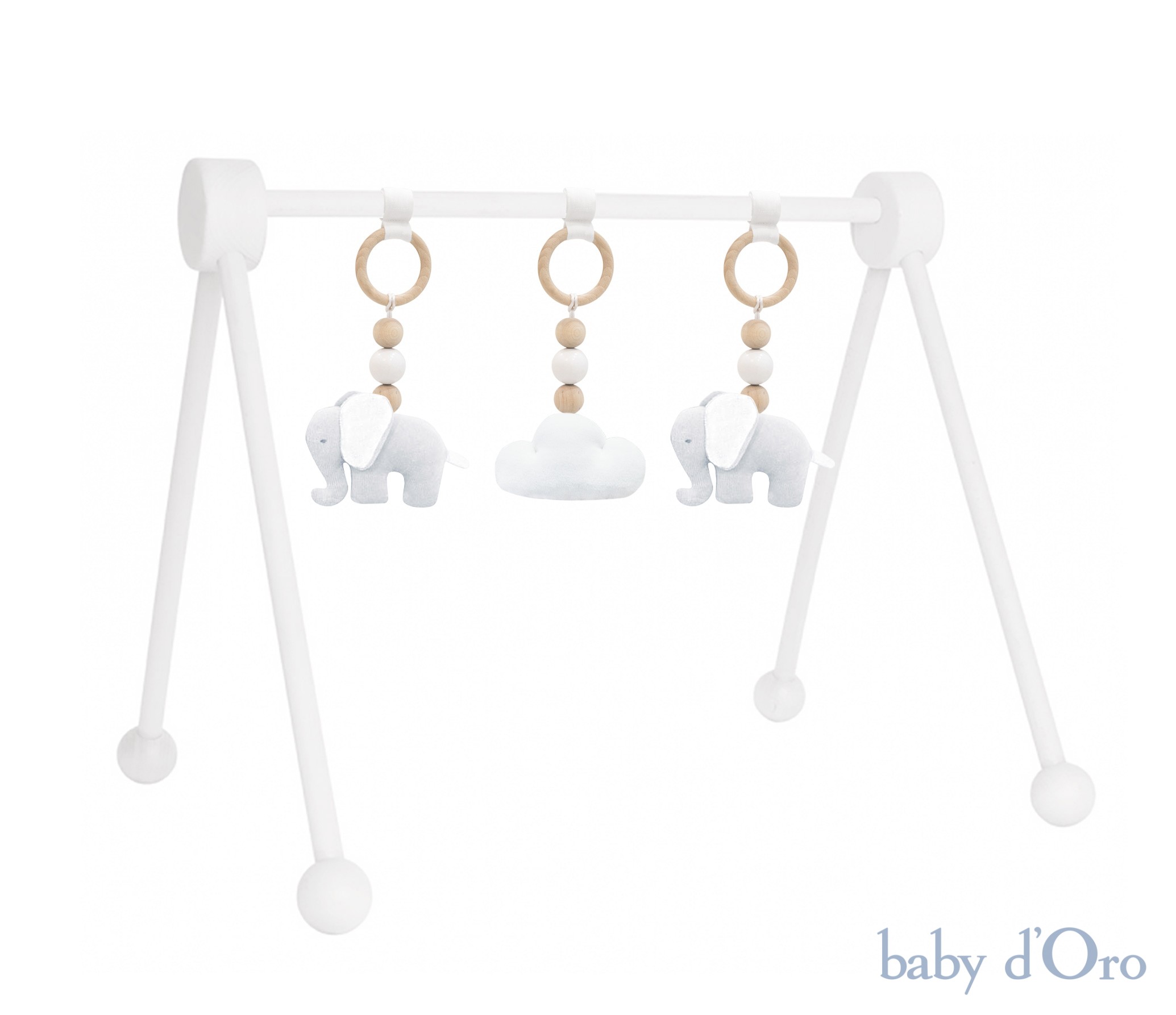 Stojak edukacyjny Baby Gym dla niemowląt wykonany jest z naturalnego drewna w kolorze białym. Szare zawieszki z motywem welurowych słoników oraz welurowa, biała chmurka stymulują ruchowo-poznawczy rozwój Maluszka. Każda zawieszka ozdobiona delikatnymi, drewnianymi kuleczkami, dzięki mocowaniu na rzep może również pełnić funkcje mobilnego gryzaka. Szeroki stelaż stojaka nie ogranicza ruchów dziecka i pozwala mu na swobodny ruch. Leżenie pod nim stanie się dla Twojej pociechy ulubioną formą spędzania wolnego czasu.